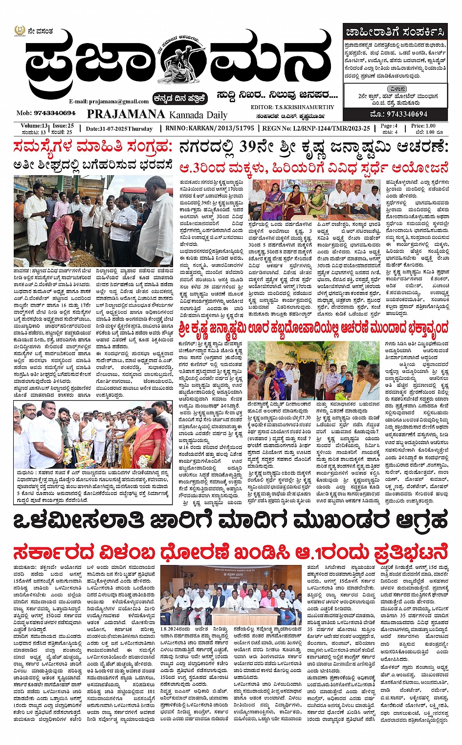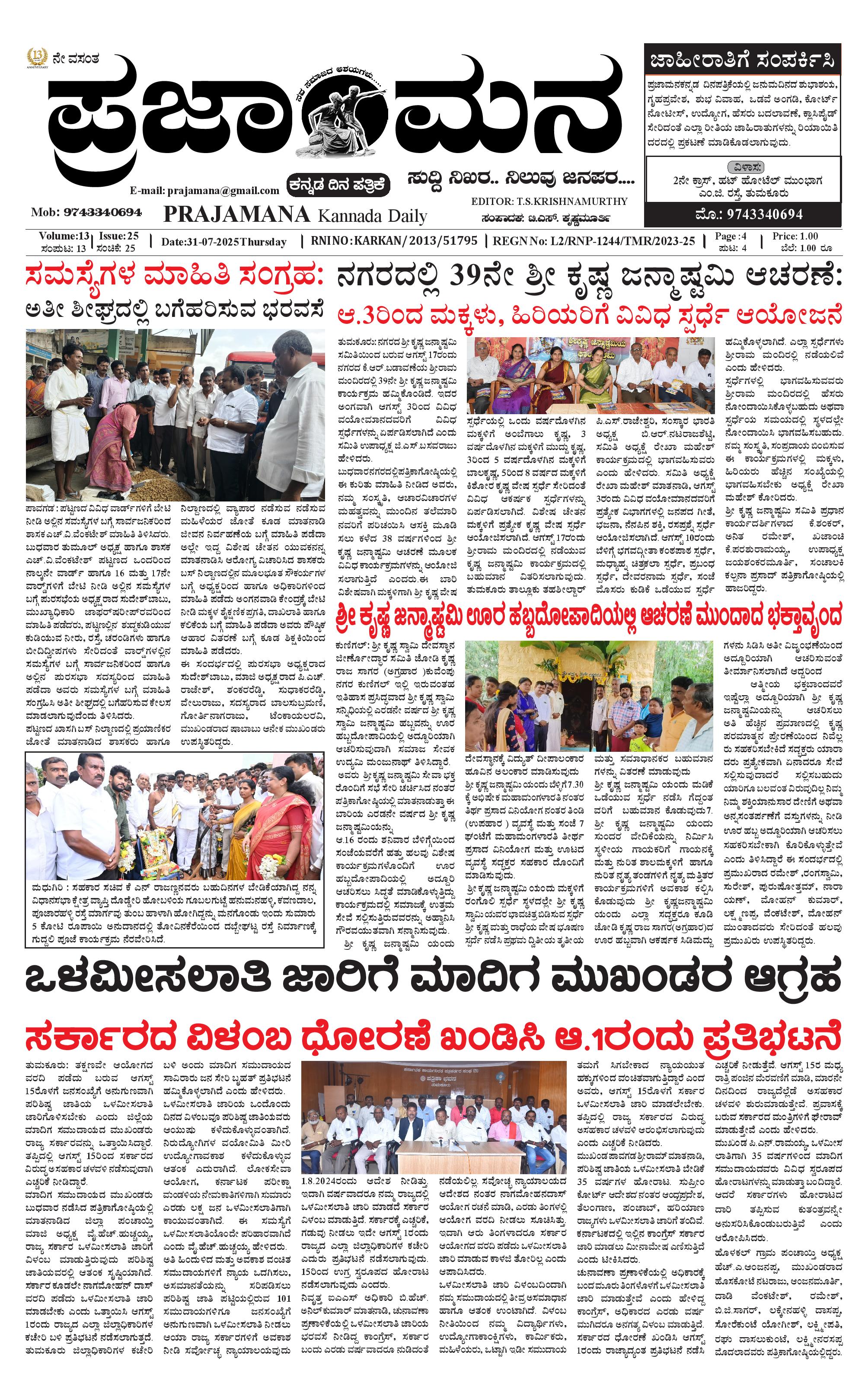 ಪ್ರಜಾಮನ 31 JULY 2025 July 31, 2025 << First << 1 >> Last >> Page 1Page 2Page 3Page 4 × ಪ್ರಜಾಮನ 31 JULY 2025 PRAJAMANA.11-page-001PRAJAMANA-page-002PRAJAMANA-page-003PRAJAMANA.11-page-004 << First << 1 >> Last >> PRAJAMANA.11-page-001PRAJAMANA-page-002PRAJAMANA-page-003PRAJAMANA.11-page-004 PRAJAMANA.11-page-001