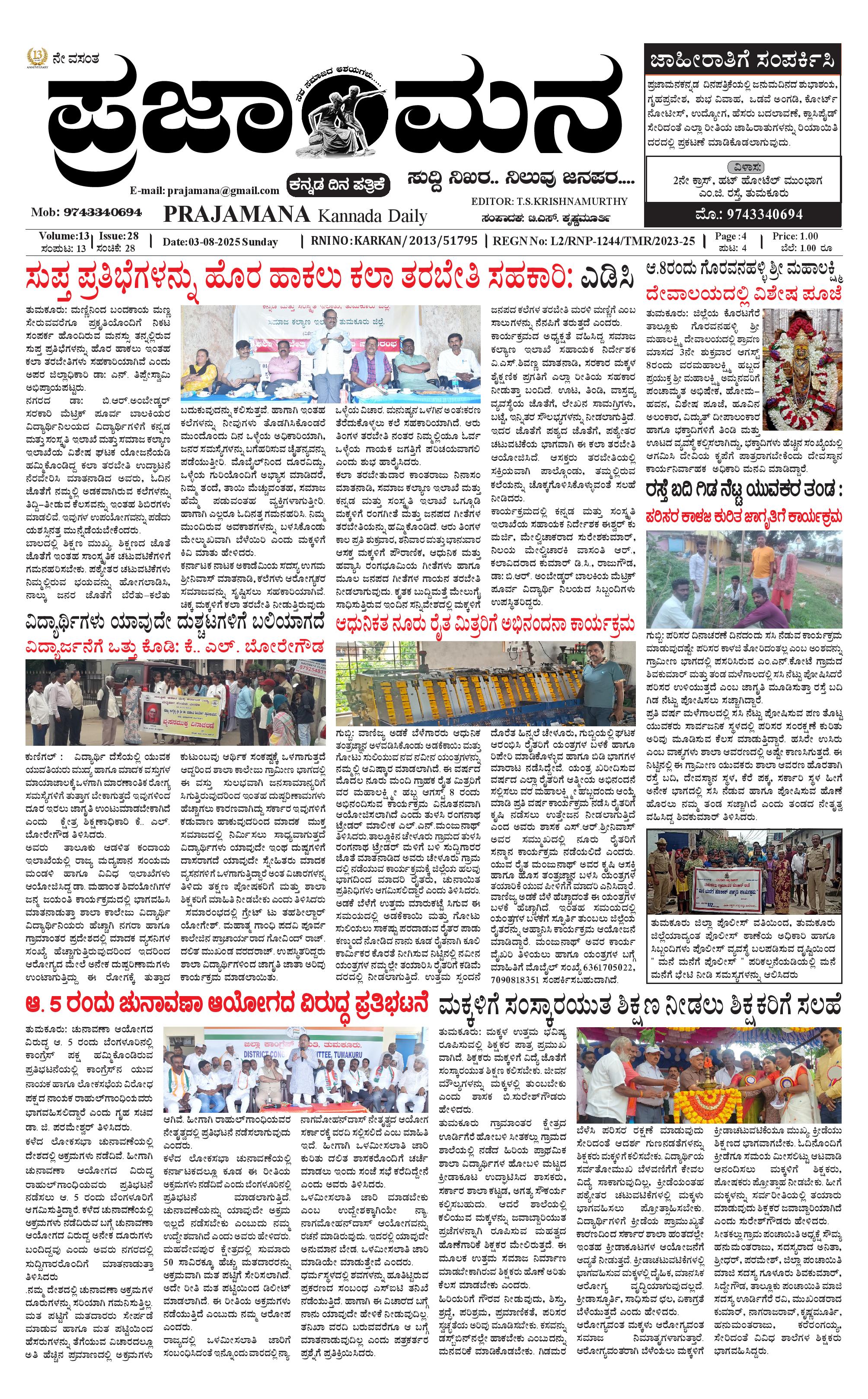 ಪ್ರಜಾಮನ 3 AUGUST 2025 August 03, 2025 << First << 1 >> Last >> Page 1Page 2Page 3Page 4 × ಪ್ರಜಾಮನ 3 AUGUST 2025 PRAJAMANA-page-001PRAJAMANA-page-002PRAJAMANA-page-003PRAJAMANA-page-004 << First << 1 >> Last >> PRAJAMANA-page-001PRAJAMANA-page-002PRAJAMANA-page-003PRAJAMANA-page-004 PRAJAMANA-page-001