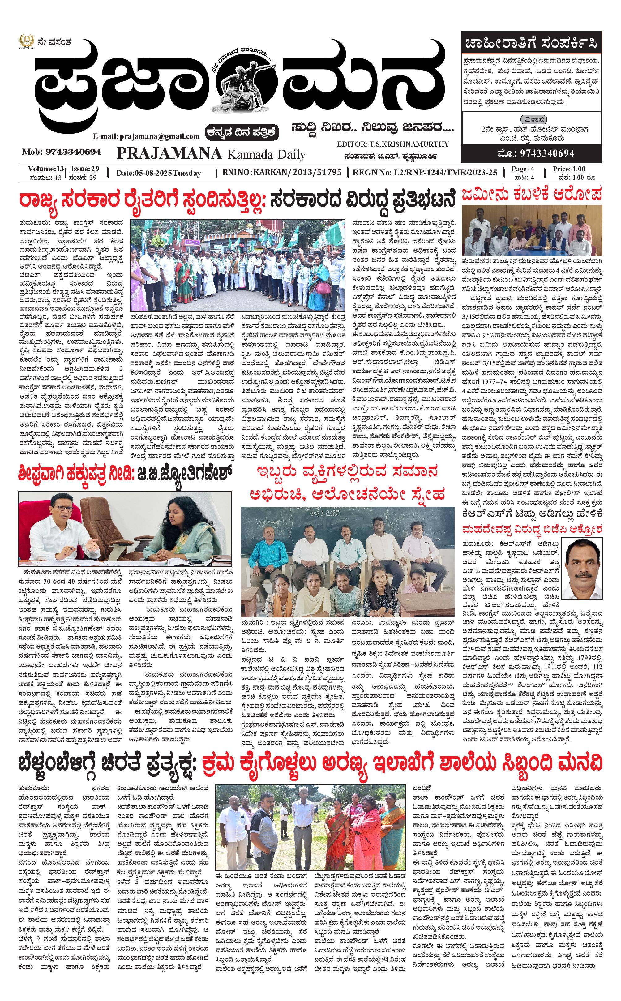 ಪ್ರಜಾಮನ 5 AUGUST 2025 August 05, 2025 << First << 1 >> Last >> Page 1Page 2Page 3Page 4 × ಪ್ರಜಾಮನ 5 AUGUST 2025 PRAJAMANA-page-001PRAJAMANA-page-002PRAJAMANA-page-003PRAJAMANA-page-004 << First << 1 >> Last >> PRAJAMANA-page-001PRAJAMANA-page-002PRAJAMANA-page-003PRAJAMANA-page-004 PRAJAMANA-page-001